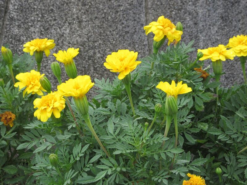最後の花は、マリーゴールド。これは、おなじみですね。暑さにも負けず、葉を勢いよく茂らせ、黄色の鮮やかな色の花を咲かせています。