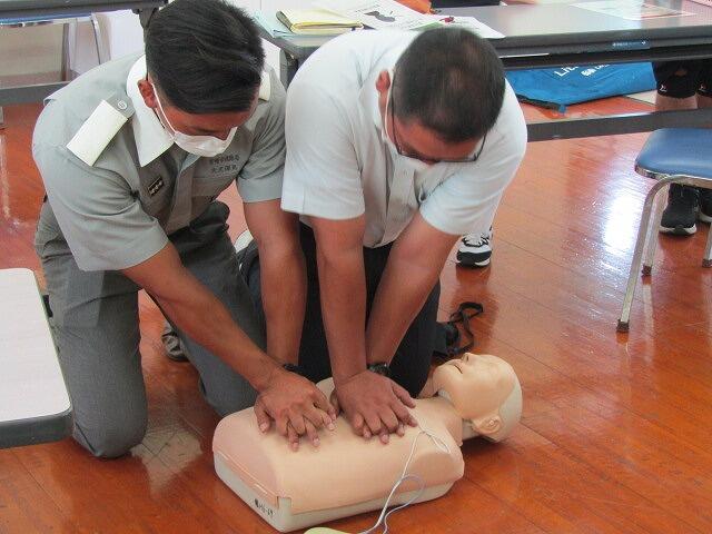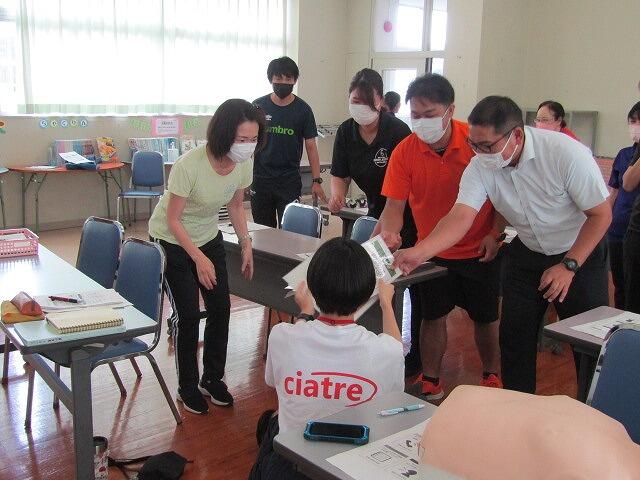 まず、南消防署勤務の大久保晃成樣を講師にお招きし、「アクションカードを用いた救命講習」を実施しました。教室で、突然、子どもが倒れたときに、どのように組織対応をするか、実演を通して指導・助言をもらいました。