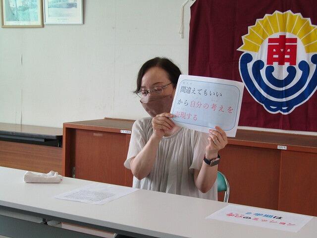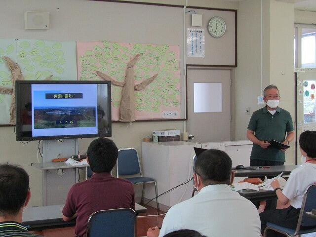 次に、本校職員である防災士の山本先生より、都農町の防災状況について説明をしてもらいました。災害が起きた場合、南小体育館が避難所になり、教職員も地域のために対応しないといけないことなどがわかり、何ができるのかをあらためて考えるきっかけとなりました。研修を通して、職員が一丸となって、南小の子どもたちの命を守るという意識を高めることができました。