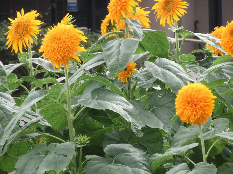 この花は八重ひまわり。オレンジ色のポンポンのようで、とても可愛らしいですね。