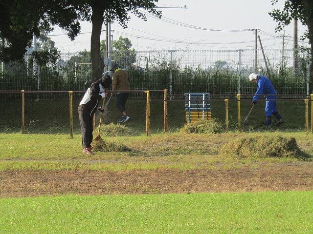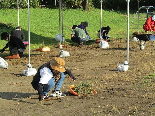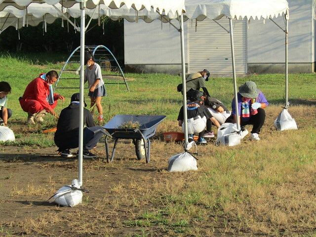 刈り払い機で周囲の草を刈っていただいたり、テント付近の草取りをしていただいたりしました。約1時間の作業でしたが、とてもきれいになりました。子ども達が昼休みに楽しく遊んだり、運動会の練習に懸命に取り組んでくれたりすることと思います。早朝からの作業、本当にお疲れ様でした。ありがとうございました