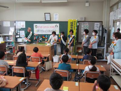 今年度も宮崎県警察本部スクールサポーターの桂様に訓練への参加と指導にご協力いただきました。不審者が侵入したときにどのように対応し、避難するのか実際の場面を想定しての訓練でした。子どもたちも職員も真剣に取り組みました。体育館に避難した後、今回の避難の仕方の課題や今後気をつけることなどについてお話をしていただきました。日頃のあいさつの重要性についても触れられました。今回の避難訓練の課題を受けて、夏季休業中に職員による研修を実施する予定です。