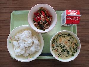 ごはん 牛乳 ニラ玉スープ こんにゃくのピリ辛炒め 544Kcal