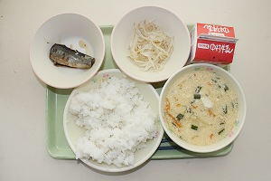 ごはん 牛乳 にらたまスープ いわししょうが煮 ゆでもやし 575Kcal