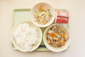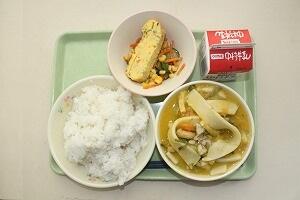 ごはん 牛乳 ほうとう汁 色どり野菜の卵焼き 付け合わせ 613Kcal