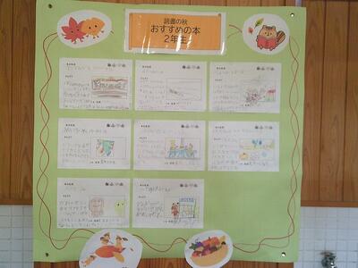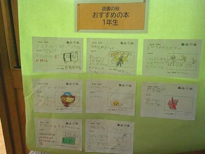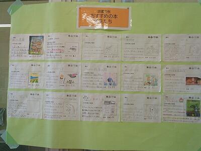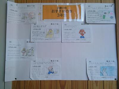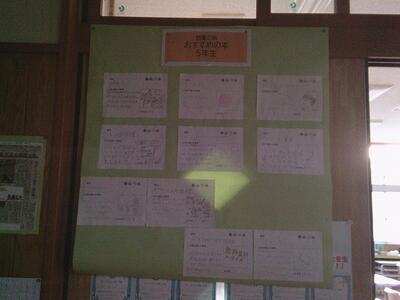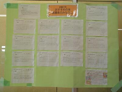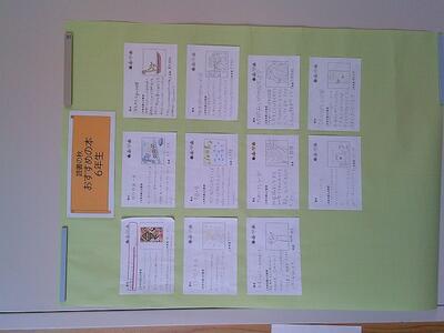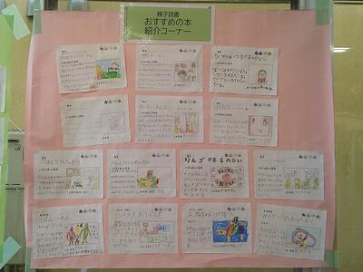 子どもたちからの「おすすめの本」そして保護者、先生たちからの「おすすめの本」も掲示しています。参観日の日に見られた保護者の方も多いと思います。