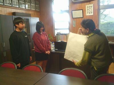 都農町社会福祉協議会から2名の方が来られ、生徒玄関前で贈呈式を行いました。
