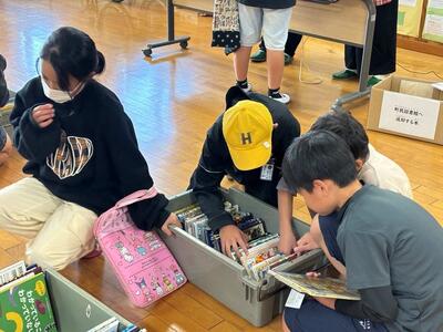 都農町図書館の方が本をたくさん持ってきてくださいました。11月は読書月間でもあり、たくさんの子どもたちが本を借りています。