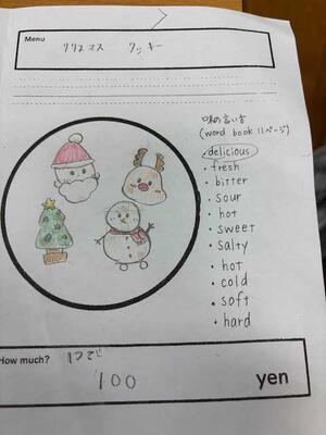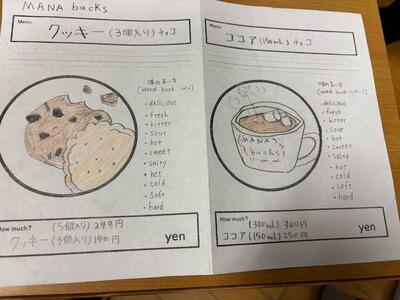 5年生の子どもたちが、6年生の子どもたちを含めたたくさんのお客様をお招きしてレストランをオープンしました。基本的にすべて英語でやりとりをします(正直、私は日本語をたくさん使ってしまいました)。代金を紙に書いて渡し、おいしい料理をたくさんいただきました。すしやステーキ、デザートなど、たくさんのメニューがありましたが、一部を紹介します。