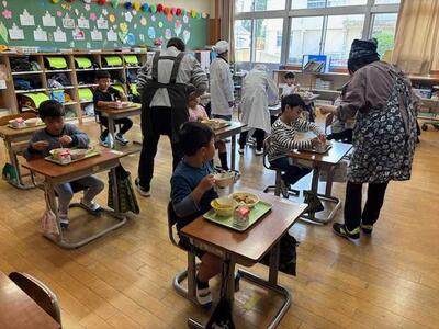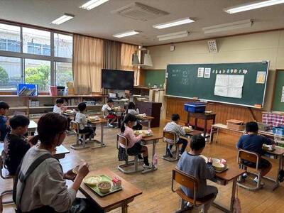 給食ができるまでに朝早くからたくさんの人が関わって準備をしていること、都農町小中学校の890名の人たちの給食を作っているのでとても大きな道具を使っていることなどたくさんのことを学びました。感謝の気持ちを忘れずに、なるべく残さずにおいしくいただきます!!