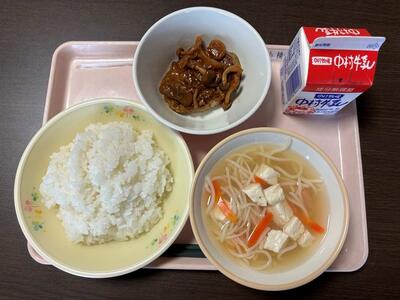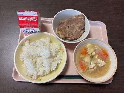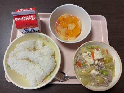 今日のメニュー【ごはん、牛乳、白玉団子汁、豚肉と厚揚げの炒め】