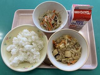 今日のメニュー【ごはん、牛乳、豆腐の中華煮、ポークシューマイ、ほうれん草とメンマのナムル】
