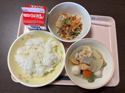 おかかマヨ和えには、「千切り大根」が使われています。大根そのものには、ビタミンCや食物繊維が多く含まれていますが、天日で干した千切り大根は、カルシウムや鉄なども含まれているそうです。じゃが豚キムチも寒い今日にはピッタリでおいしい給食でした。