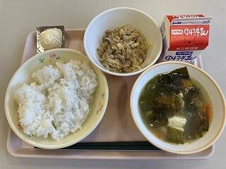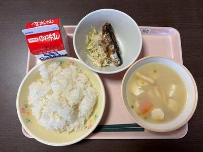 今日のメニュー【ごはん、牛乳、じゃがいもの味噌汁、イワシのおかか煮、キャベツのささみ和え】
