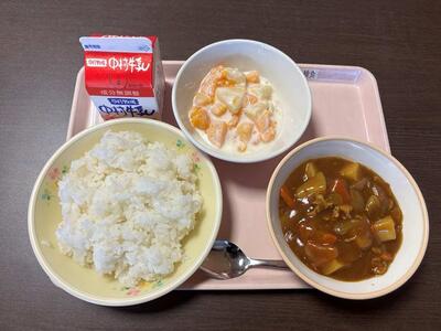 今日のメニュー【ごはん、牛乳、ポークカレー、フルーツヨーグルト】