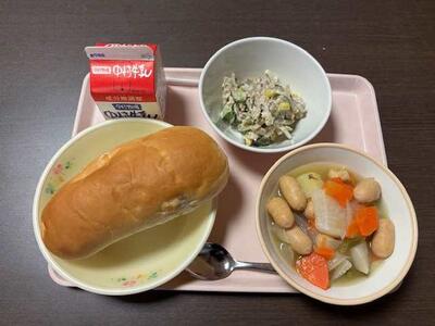 今日のメニュー【コッペパン、牛乳、かぼちゃのシチュー、ツナとレンコンのサラダ】