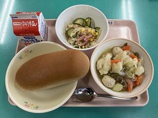 今日のメニュー【揚げパン、牛乳、肉団子スープ、フルーツゼリー和え】