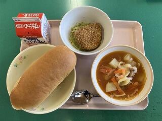 今日のメニュー【ミルクパン、牛乳、ミネストローネ、かぼちゃ挽肉フライ、ゆでキャベツ】