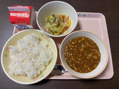 今日のメニュー【ごはん、牛乳、ひき肉と豆のカレー、みかんのサラダ】