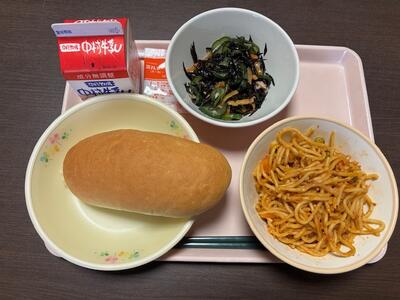 今日のメニュー【ミニミルクパン、牛乳、スパゲッティミートソース、カルシウムたっぷりサラダ】