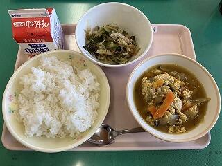 今日のメニュー【ごはん、牛乳、ミートボールカレー、ひじきとごぼうのマヨネーズ和え】