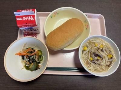 今日のメニュー【ミニコッペパン、牛乳、コーンラーメン、海藻サラダ、マーシャルビーンズ】