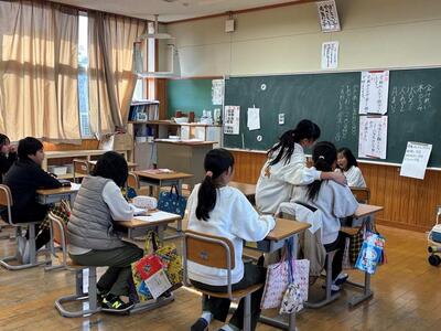 今日は、分校と本校の子どもたちが一緒に3時間授業を行い、一緒に給食を食べて、一緒に昼休みを遊ぶ合同学習の日です。一緒に学習をしながらより多くの人数で体育をしたり、音楽をしたりとたくさん楽しめました。