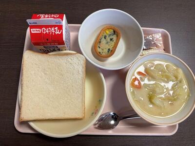 今日のメニュー【ミルクパン、牛乳、ミネストローネ、かぼちゃ挽肉フライ、ゆでキャベツ】