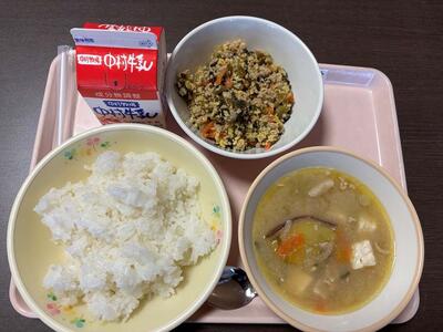 今日のメニュー【ごはん、牛乳、さつま汁、高菜そぼろ丼】