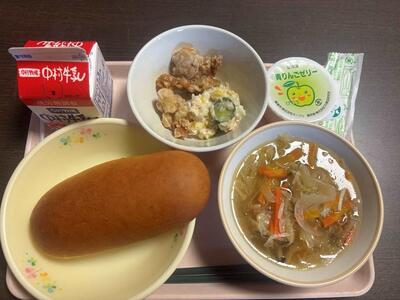 今日のメニュー【ミニチーズパン、牛乳、千切り野菜のスープ、塩から揚げ、ポテトサラダ、青りんごゼリー】