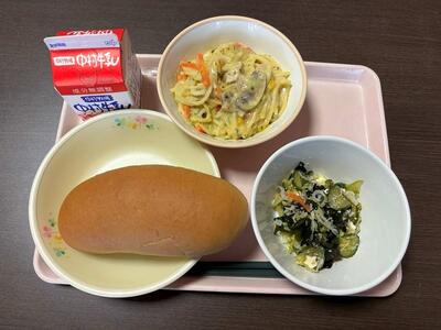 今日のメニュー【ミニ黒糖パン、牛乳、クリームスパゲティ、カルシウムたっぷりサラダ】
