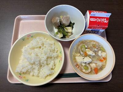 今日のメニュー【ごはん、牛乳、白玉団子汁、豚肉と厚揚げの炒め物】