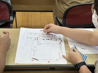 1学期の終わりに5・6年生にも侵入口を考えてもらい、赤いシールが貼られた校舎配置図に、先生方が考えた侵入口に青いシールを貼っていきました。赤と青のシールはほぼ同じところに貼られていました。