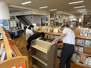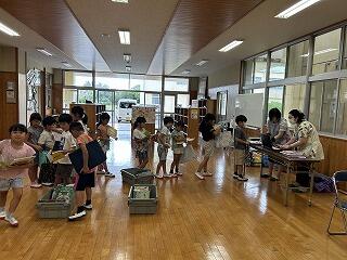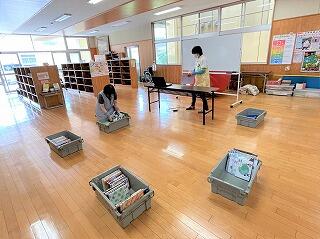 子どもたちがお昼休みになる前に、来校した町民図書館のスタッフさん方が貸出の準備をしてくださいます。