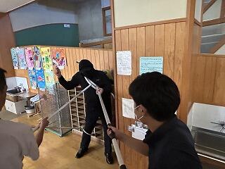 2日目の昨日は、5時間目に5~6年生と一緒に、寺迫奴踊で使用する「長い杖(じぇ)作り」に参加していました。