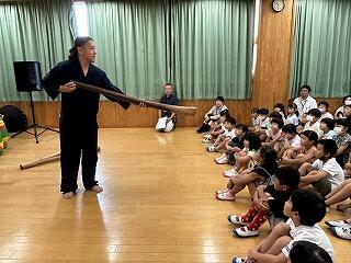 作り方は短い杖と同じだという説明に納得顔の5~6年生に対して、そもそも「寺迫奴踊とは?」の表情の中学生。