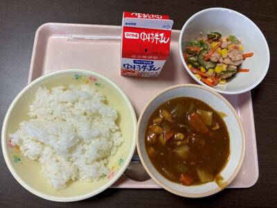 今日のメニュー【ごはん、牛乳、チキンカレー、アスパラガスのサラダ】