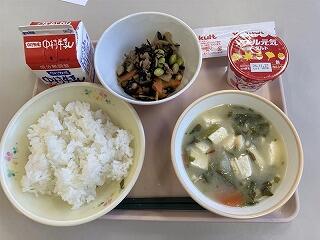 今日のメニュー【ごはん、牛乳、大根葉のみそ汁、ひじきの炒め煮、ヨーグルト】