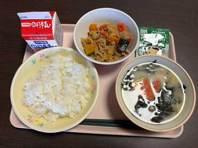 今日のメニュー【ミルクパン、牛乳、もずくスープ、なすと豆のミートソース煮】