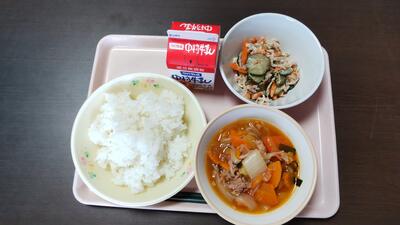 今日のメニュー【ごはん、牛乳、千切り野菜のスープ、ドライカレー】