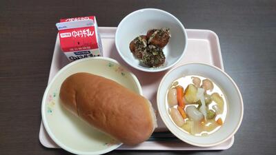 今日のメニュー【黒糖パン、牛乳、ポトフ、揚げたこ焼き】