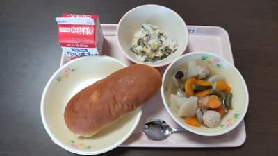 今日のメニュー【りんごパン、牛乳、肉団子と野菜のスープ煮、ポテトサラダ】