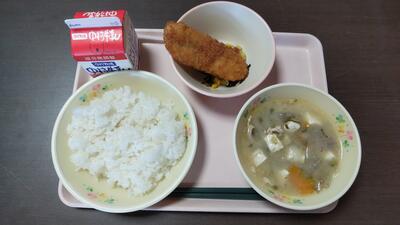今日のメニュー【ご飯、牛乳、豚汁、白身魚フライ、ごま和え】