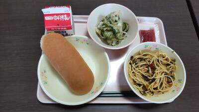 今日のメニュー【ミニコッペパン、牛乳、高菜スパゲッティ、グリーンサラダ、いちごジャム】