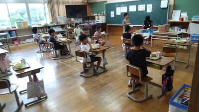 元気いっぱい給食を食べて、元気モリモリの1年生です。給食がおいしいのでどんどんお代わりをしています。