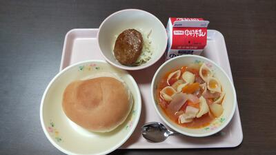 今日のメニュー〈バーガーパン、牛乳、ミネストローネ、照り焼きパティ、ゆでキャベツ】