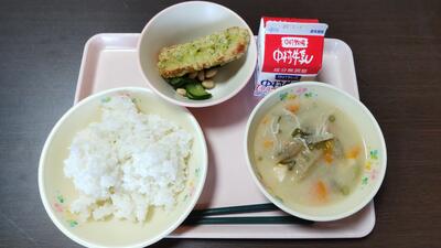 今日のメニュー【ご飯、牛乳、野菜のごま汁、ちくわの磯辺揚げ、キュウリと大豆の和え物】