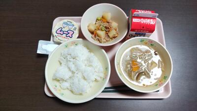 今日のメニュー【ご飯、牛乳、なすの味噌汁、じゃがいものそぼろ煮、ムース】