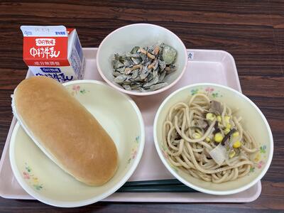 今日のメニュー【ミルクパン コーンラーメン ひじきとごぼうのマヨネーズあえ 牛乳】