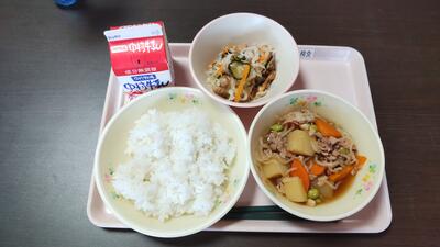 今日のメニュー【ご飯、牛乳、肉じゃが、まだか漬け】